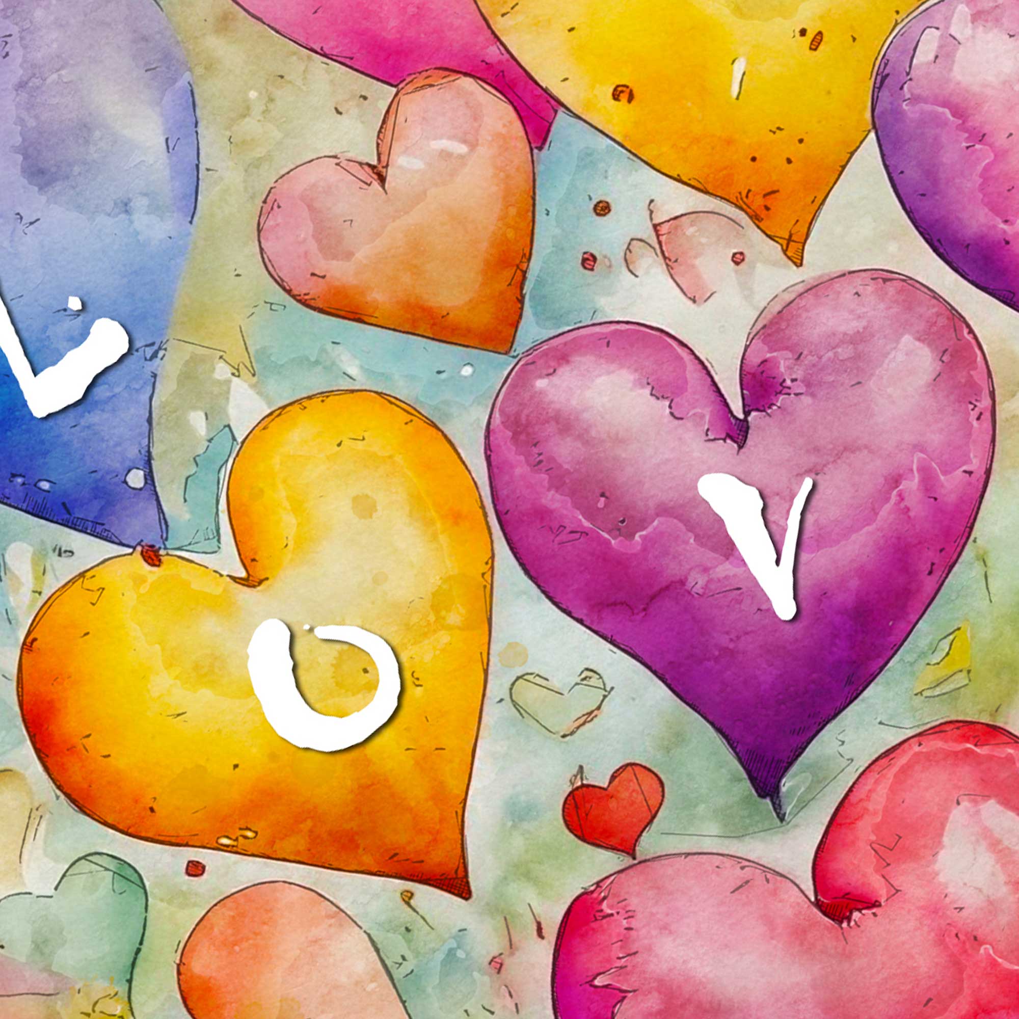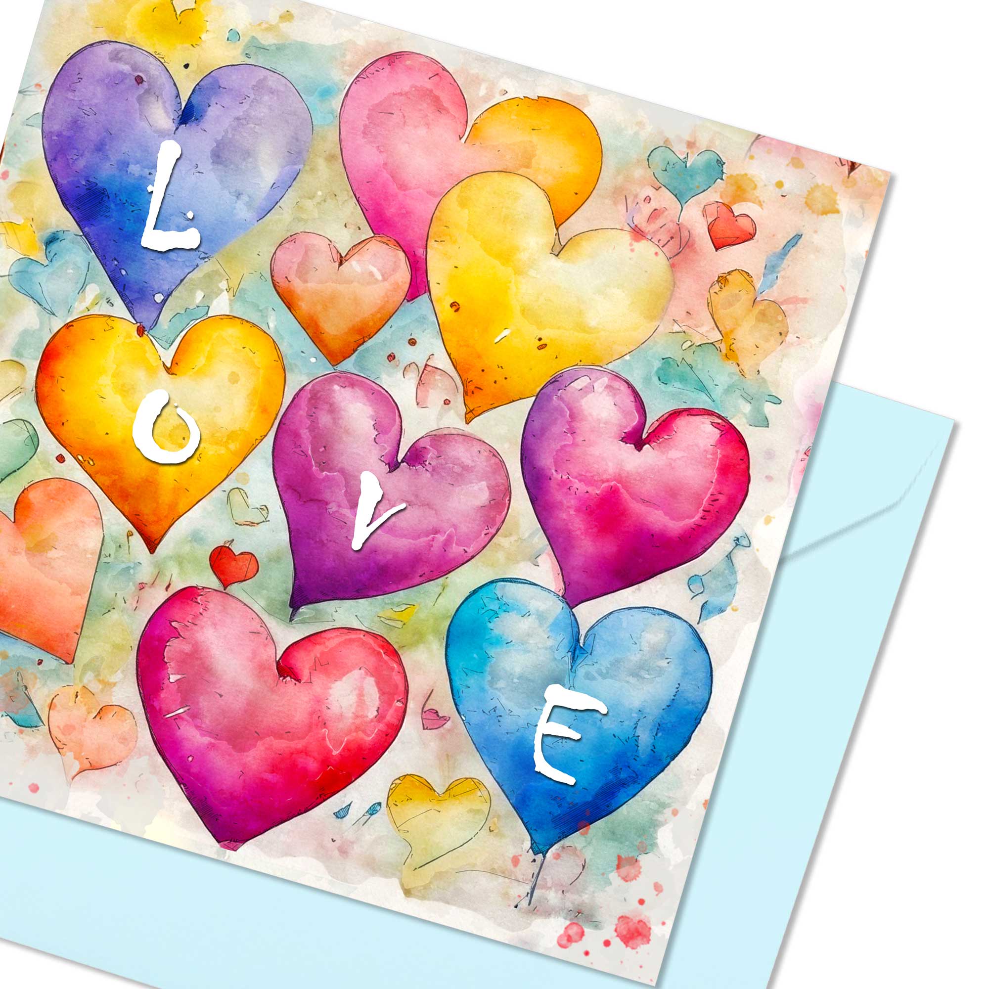 Make someone’s heart flutter with this colourful love hearts card, Featuring a host of multicoloured hearts with the letters L O V E on four of the hearts.