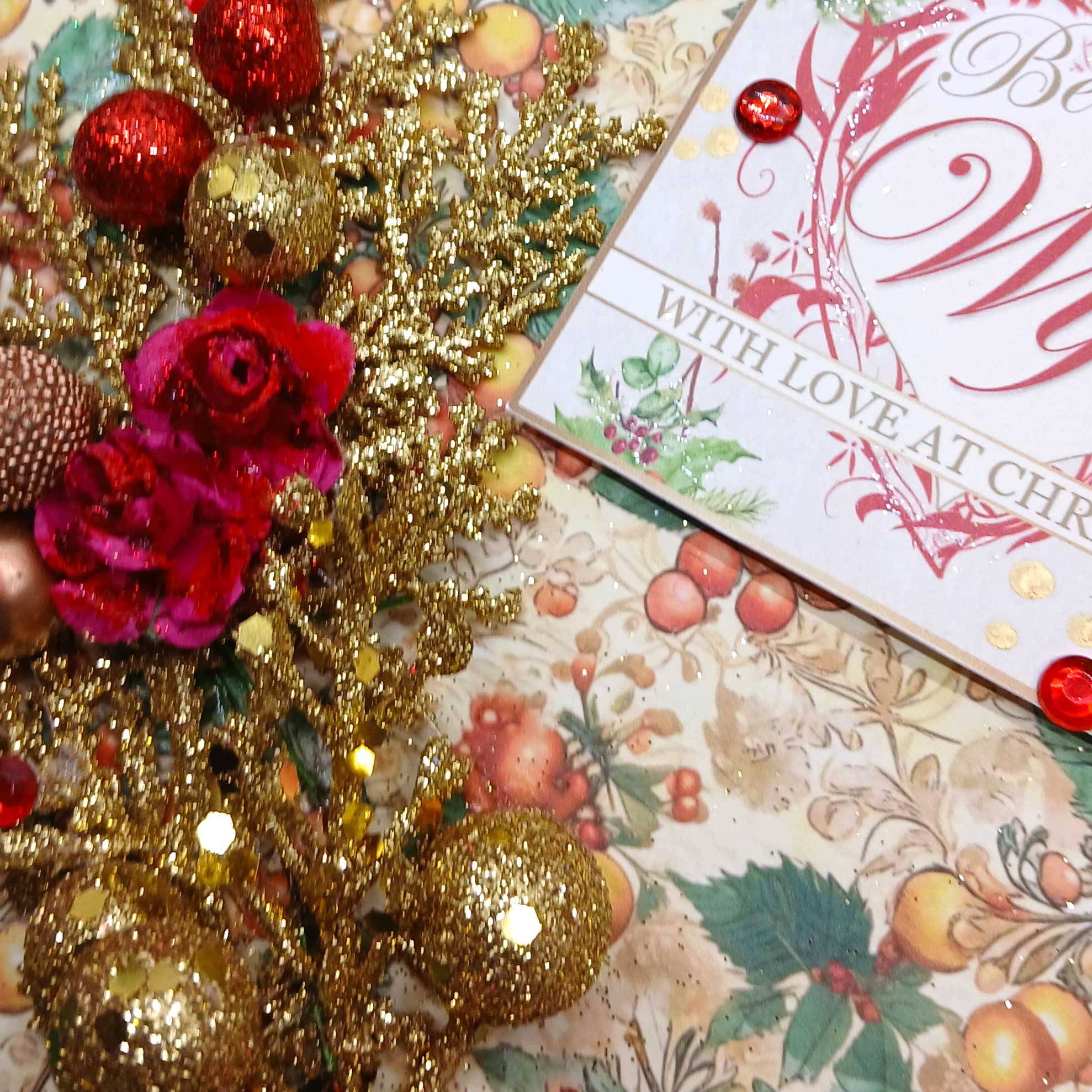 A luxurious 3-Dimensional Christmas Card with a spray of red and gold Christmas foilage for that special person at Christmas.