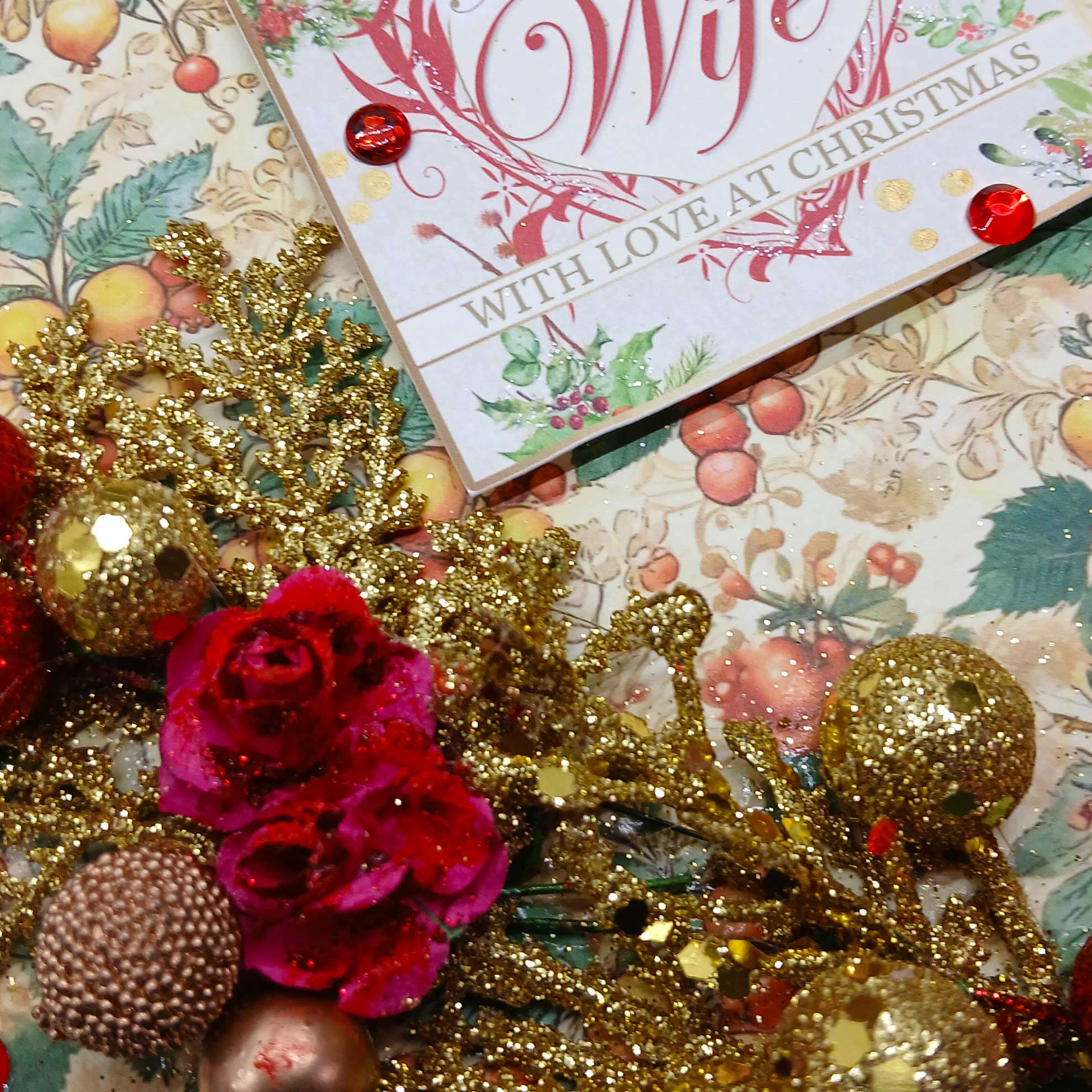 A sophisticated Christmas Card with a sentiment reading “To my Beautiful Wife with Love this Christmas”. Furthermore it is presented on textured card stock. In addition,the card is embellished with lots of sparkle. It is presented in a white box.