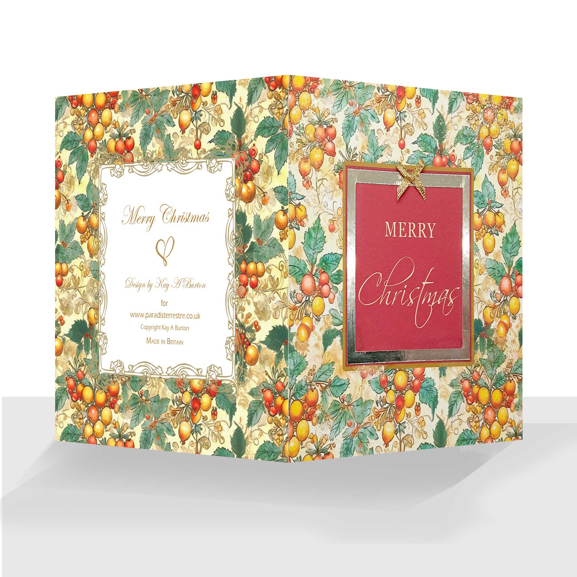 A elegant Christmas card finished with a slightly raised gold foil frame and gold bow on a richly coloured berry background. The words “Merry Christmas” are on the front of the card, written in an elegant font.