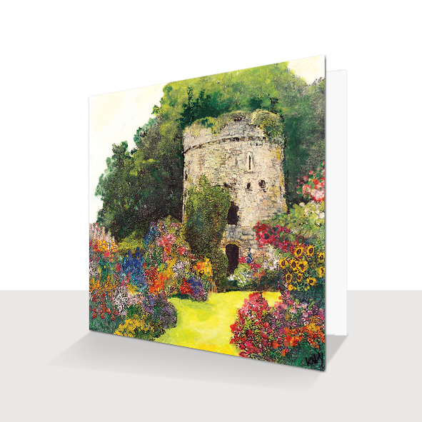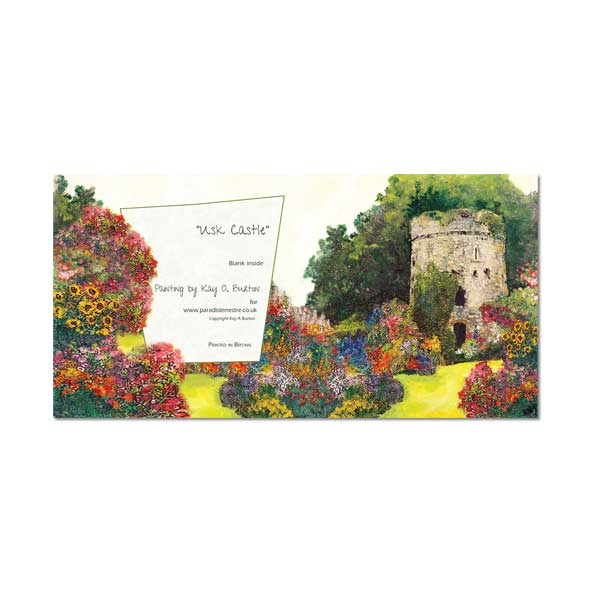 A luxury art print card titled “Usk Castle” from an original painting by artist Kay Burton. Usk Castle is situated In central Monmouthshire. These greetings cards are digitally printed on to a textured white board (FSC rated card stock). Moreover, the texture and subtle sheen on these cards enhances the printed image of the original painting. They are left blank for special messages and supplied with a white envelope and protected in a clear film sleeve.